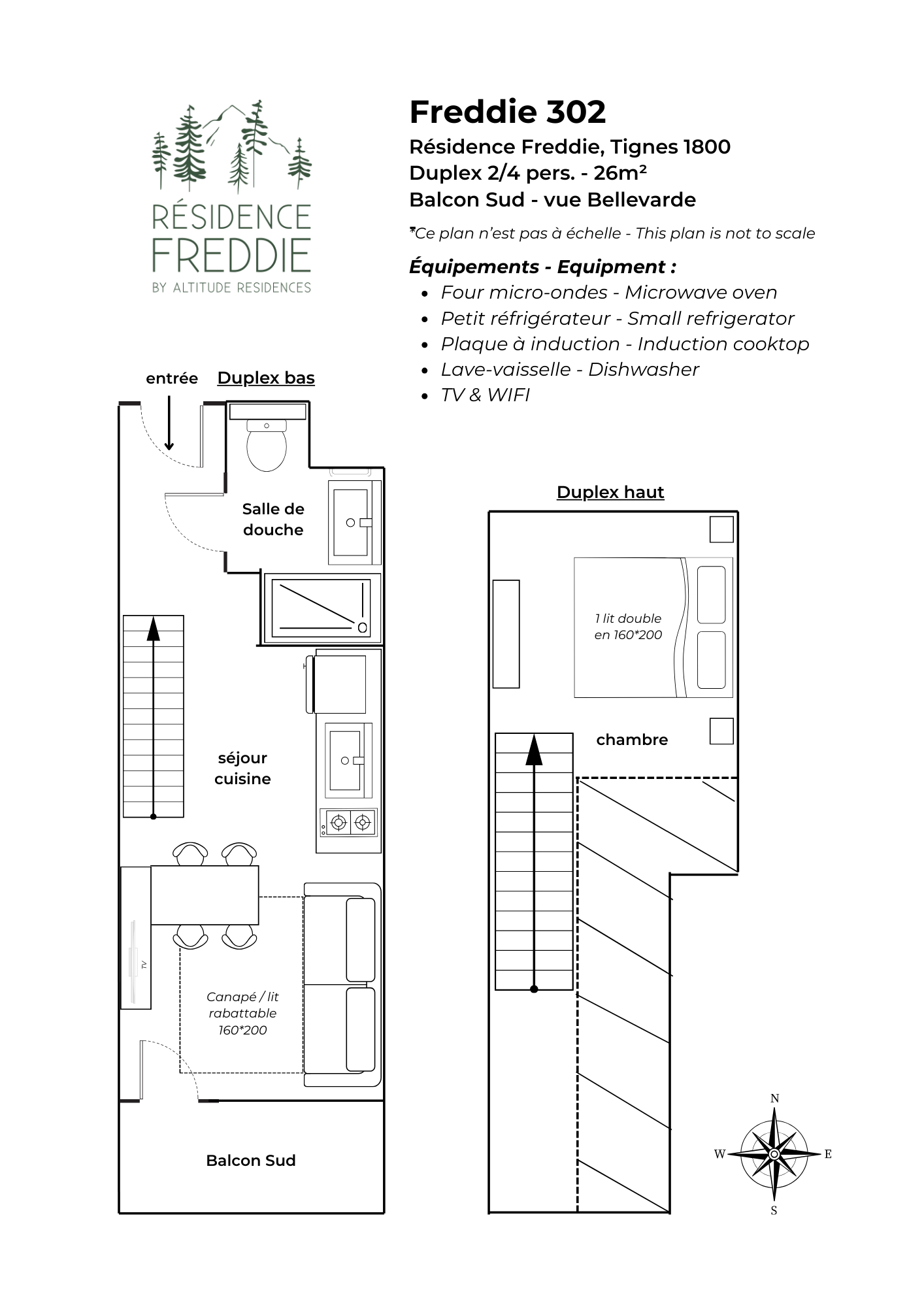 Découvrez le parfait équilibre entre espace, confort et esprit montagne avec cet appartement en duplex de 26 m², idéal pour accueillir jusqu’à 4 personnes. Situés aux niveaux 3 et 4, ce logement offre un cadre privilégié pour profiter pleinement de la montagne, avec accès direct aux pistes pour un séjour ski aux pieds. L’agencement astucieux et modulable comprend une chambre avec 1 lit double (160*200), un séjour convivial avec un canapé-lit double rabattable (160*200), et 1 salle de douche moderne. Pour profiter de la vue, l'appartement dispose d'un balcon orienté Sud, parfait pour des moments de détente après une journée sur les pistes.