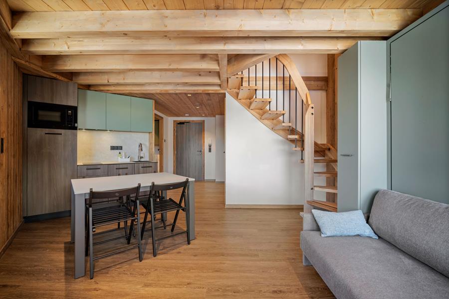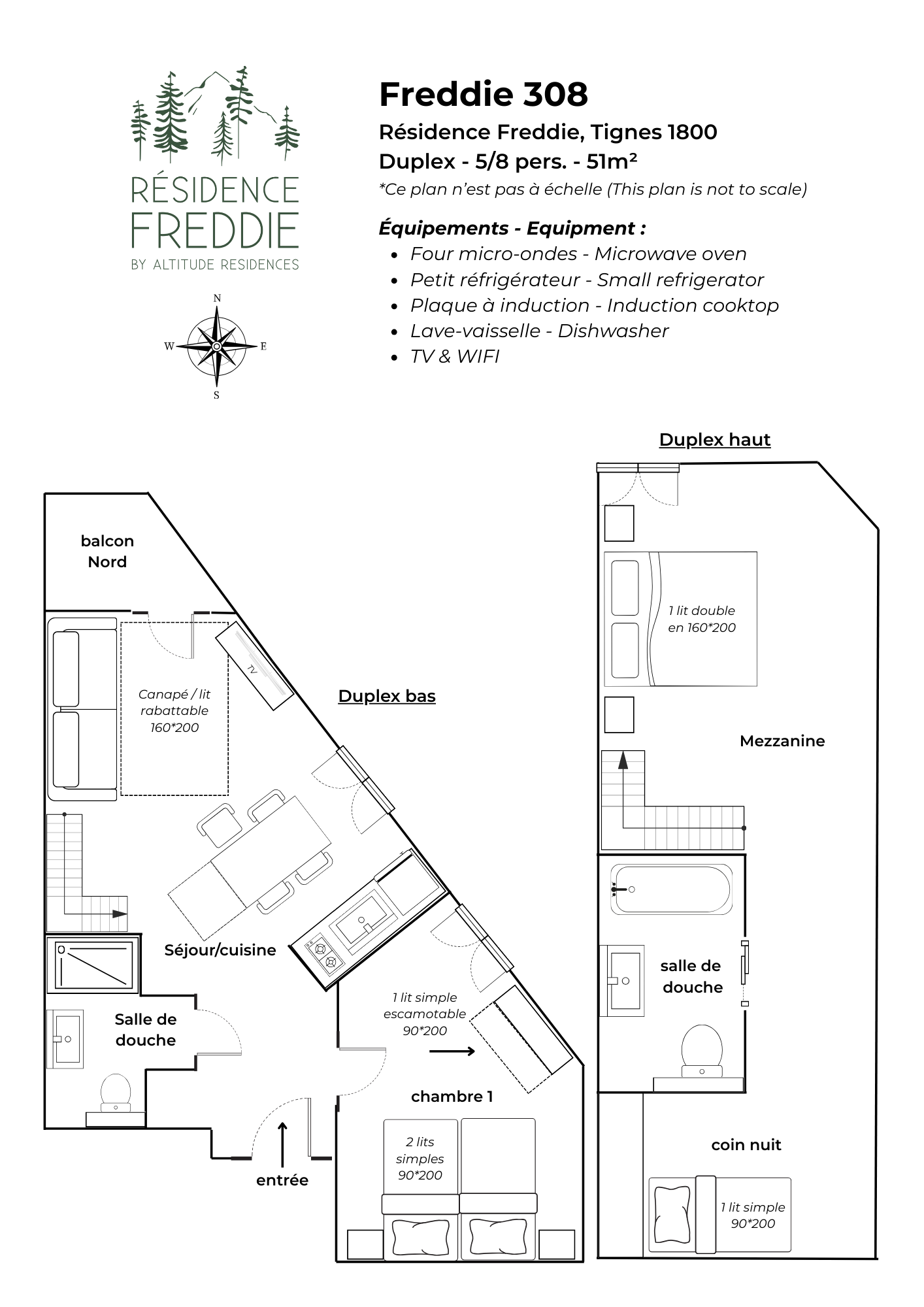Vivez l’expérience ultime de la montagne dans notre appartement duplex de 51 m², pensé pour accueillir confortablement jusqu’à 8 personnes. Idéal en famille ou entre amis, skis aux pieds, ce duplex combine confort et fonctionnalité, avec accès direct aux pistes pour un séjour inoubliable. L'appartement se compose d'une chambre avec 2 lits simples et 1 lit simple escamotable, une mezzanine avec un lit double, 1 coint nuit avec un lit simple, un séjour convivial avec un canapé-lit double rabattable et 2 salles de douche modernes. Il dispose également de 2 balcons orientés nord, idéal pour admirer la vue après une journée sur les pistes.